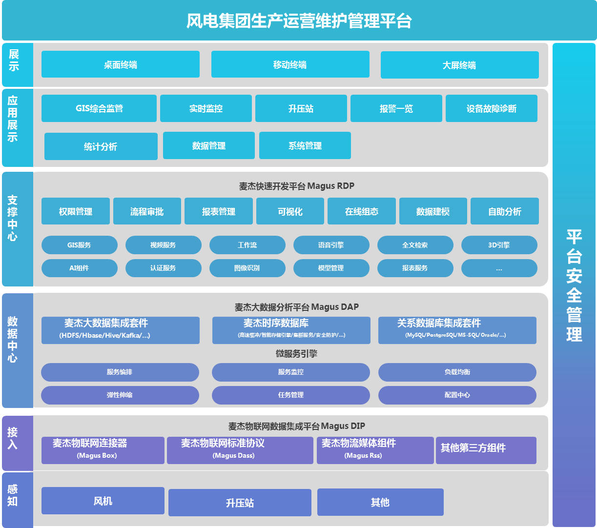 采用Magus IoT平台,通过平台强大的组态工具和安全集控技术,建立了区域风电远程集控中心涵盖包括实时监视、生产运行、安全管理、工单管理、资产管理、人员管理、人力资源、移动检修及专业应用,实现了多风场的集中监测、远程控制和管理。